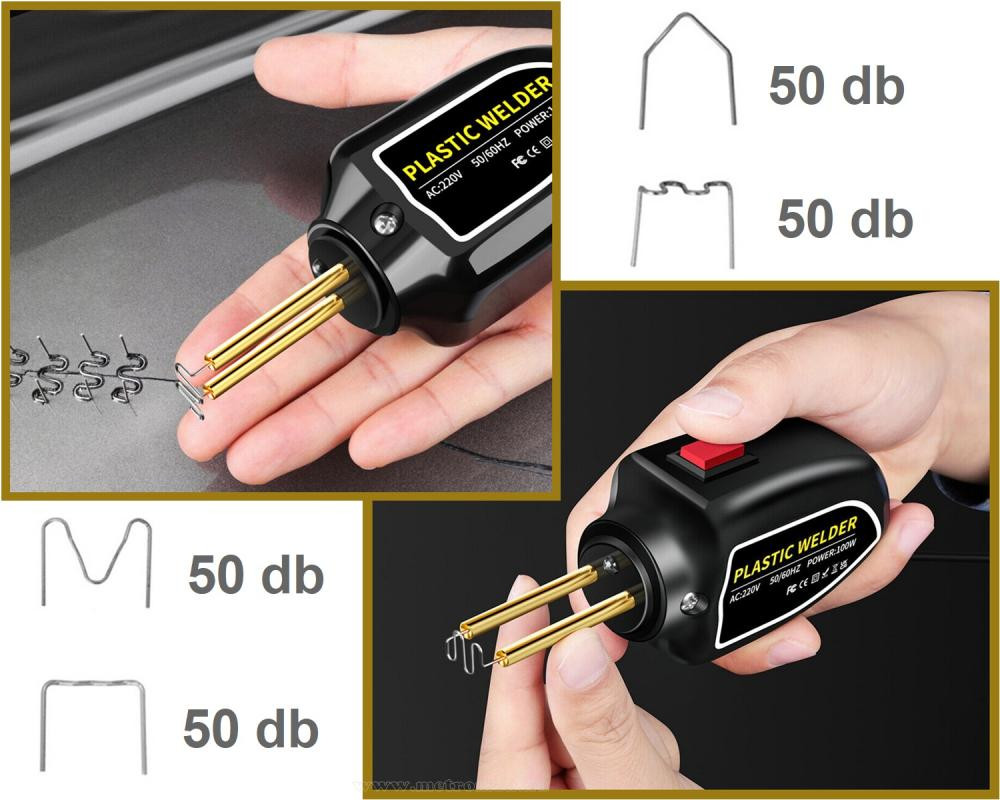 A műanyag hegesztő készlet segítségével egyszerűen, gyorsan javíthat meg sérült műanyag alkatrészeket. Alkalmas különféle műanyagok pl. autóelemek, lökhárító, műszerfal vagy kerti szerszámok törött burkolatának javításához. Csak nyomja a készülék által felhevített kapcsot a repedésbe, mely a lehűlést követően megerősítő hidat képez a két rész között, tartósan összezárva az anyagot. A 4 féle, összesen 200 db tűzőkapocs különböző formájú sérülések rögzítésére használható. Tartozék műanyag doboz a kényelmes tároláshoz és szállításhoz.