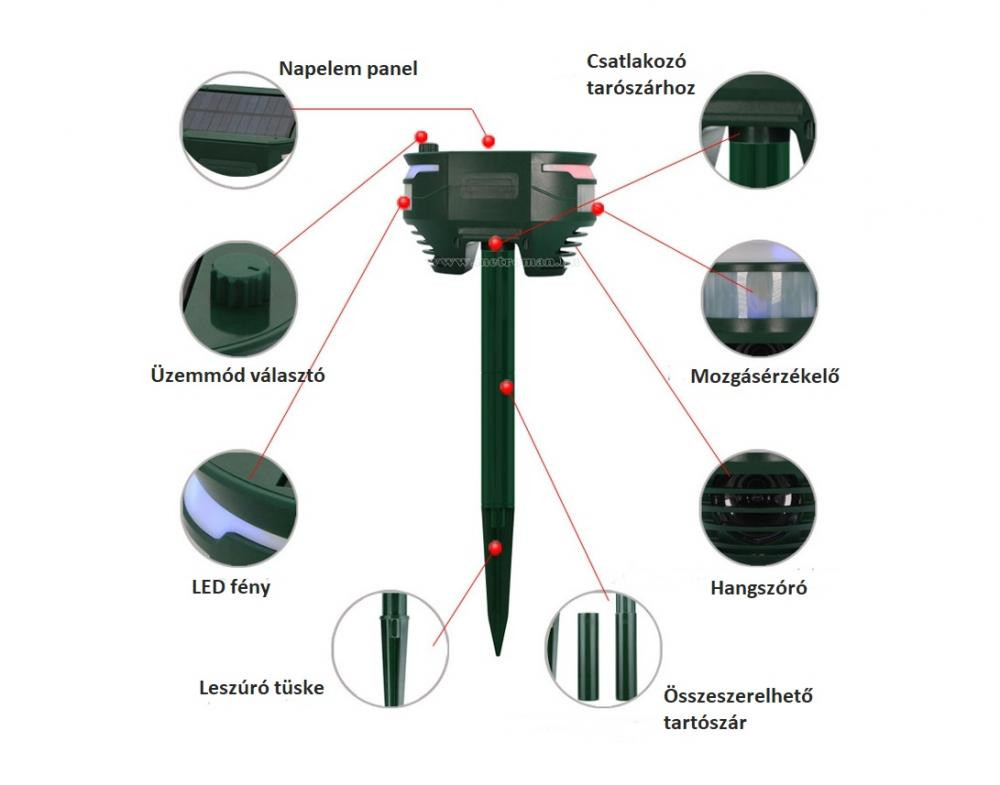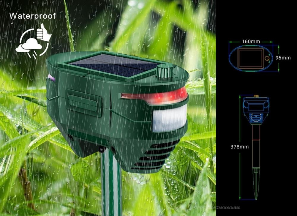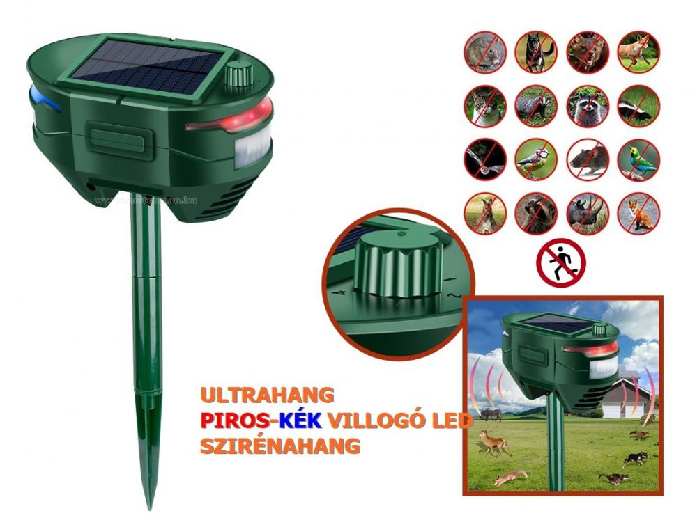 A napelemes multifunkciós kisállatriasztó hatékonyan távol tartja a kutyákat, macskákat, madarakat, rókákat, borzokat, vaddisznókat, egereket, patkányokat és egyéb kisebb rágcsálókat. A mozgásérzékelő automatikusan kapcsolja a kiválasztott riasztást. Nemcsak ultrahangot, hanem hallható szirénahangot is kibocsájt és piros-kék villogással fokozza a riasztást, így akár behatolás jelzőként is alkalmazható.