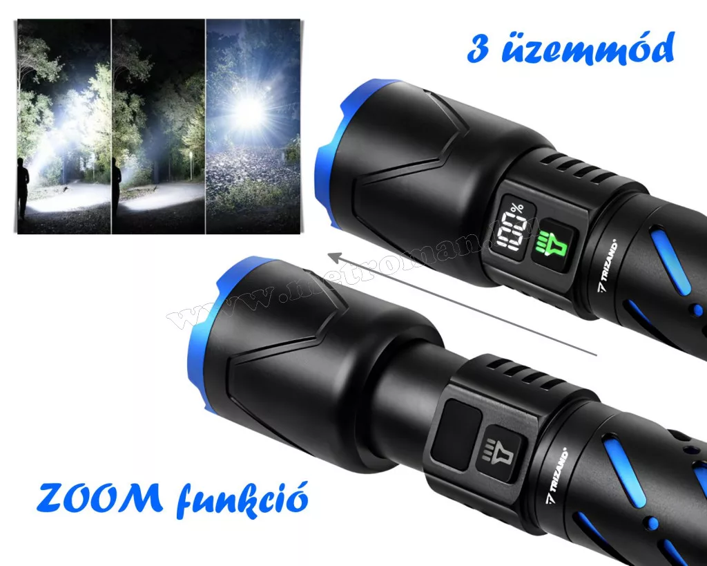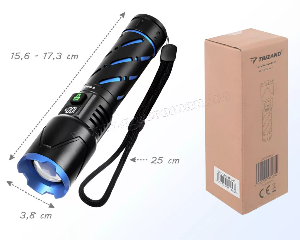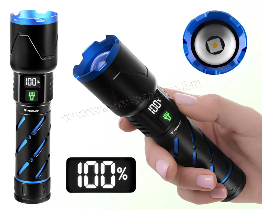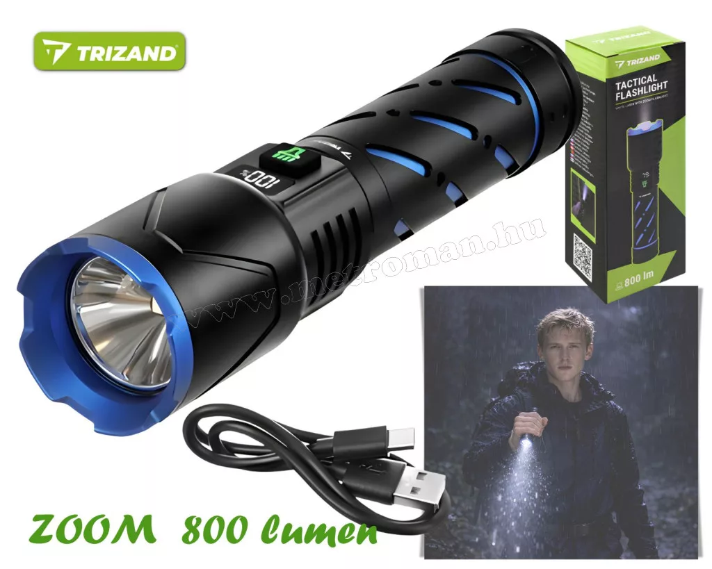 A TRIZAND újratölthető LED zseblámpa a professzionális fényerő és a sokoldalúság ötvözete. A 800 lm fényáram és az állítható zoom funkció akár 200 m távolságba is elvilágít. A masszív, vízálló alumínium ház egy brutális, 5000 mAh kapacitású akkumulátort rejt, amely USB-C porton tölthető, és PowerBank funkcióval is rendelkezik. Ideális választás túrázáshoz, autóba vagy otthoni vészhelyzetekre – megbízható társ, amely sosem hagyja sötétben!