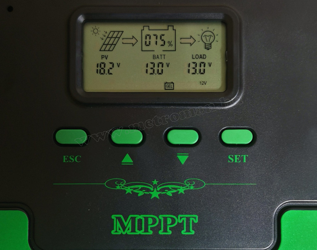 Az előlapi LCD kijelző áttekinthetően mutatja a napelem, az akkumulátor és a terhelés aktuális feszültségét, áramát, a napi és összesített energiatermelést. A beállítómenüben egyszerűen kiválasztható az akkumulátortípus, megadhatók a töltési feszültségek, valamint konfigurálható a LOAD (terhelés) kimenet üzemmódja – például: