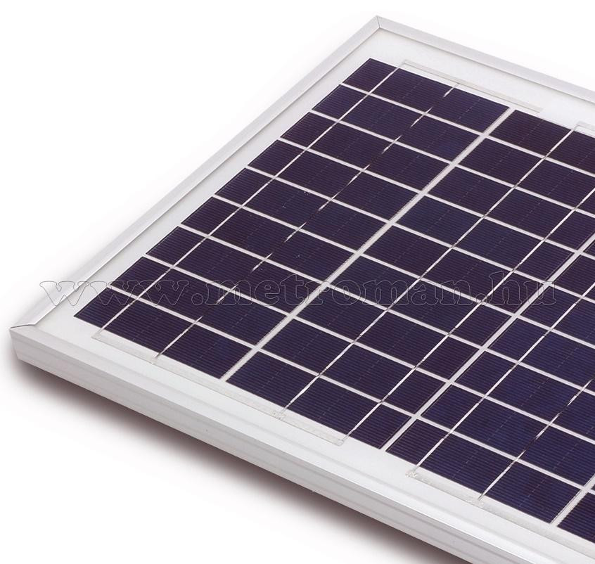 Polikristályos napelem panel, masszív, eloxált alumínium kerettel. Kitűnően használható háztetőkön , lakókocsikon, lakóautókon, kempingezéshez, hajókon, hétvégi házakhoz, villanypásztorokhoz stb.