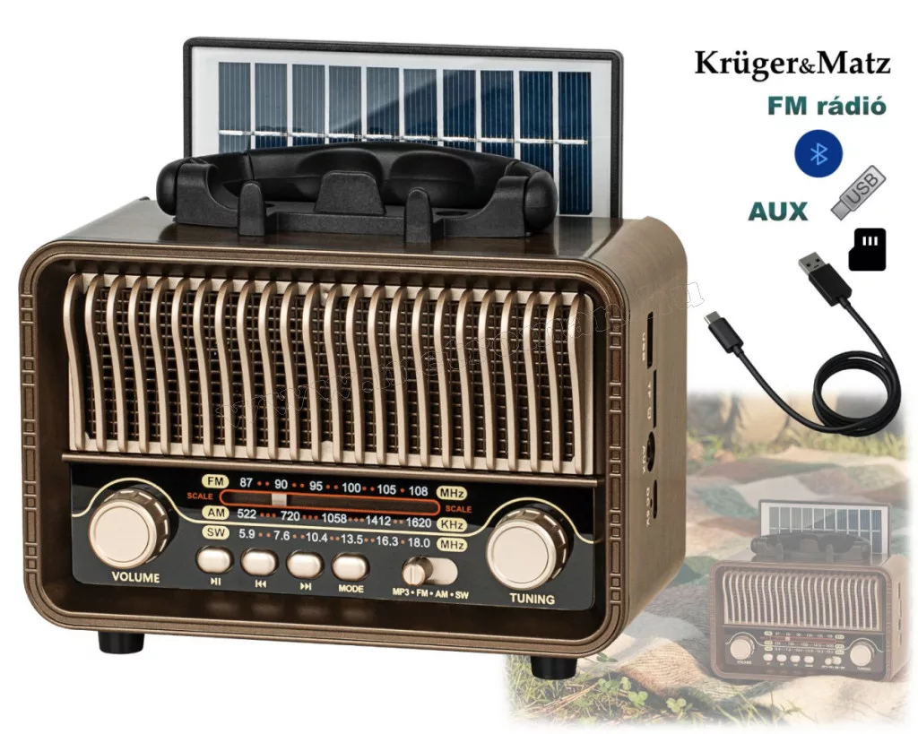 Ennek a kisméretű Kruger&Matz retró rádiónak köszönhetően többé nem marad le kedvenc rádióműsorairól, túrázás, horgászás, kempingezés vagy kertészkedés közben sem. A klasszikus retró stílusú rádióvevőt modern technológiával ötvözi, napelemmel és USB-C kábelről tölthető akkumulátorának valamint elemes tápellátási lehetőségének köszönhetően áramszünetben is hozzáférést biztosít zenéhez, hírekhez és kommunikációhoz.