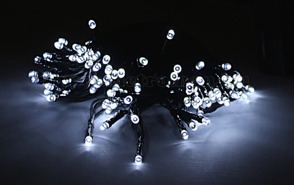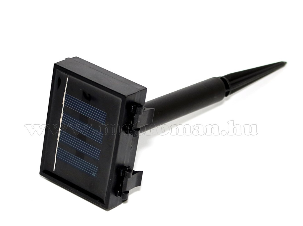 •  100 LED izzó füzéren egy leszúró tüskével ellátott vezérlőegységhez csatlakoztatva. (A vezérlőegység tartalmazza a napelemet az akkumulátort és az alkáli elemet is. Az alkáli elemet ha lemerül cserélni kell mert ezt  nem tölti a napelem )