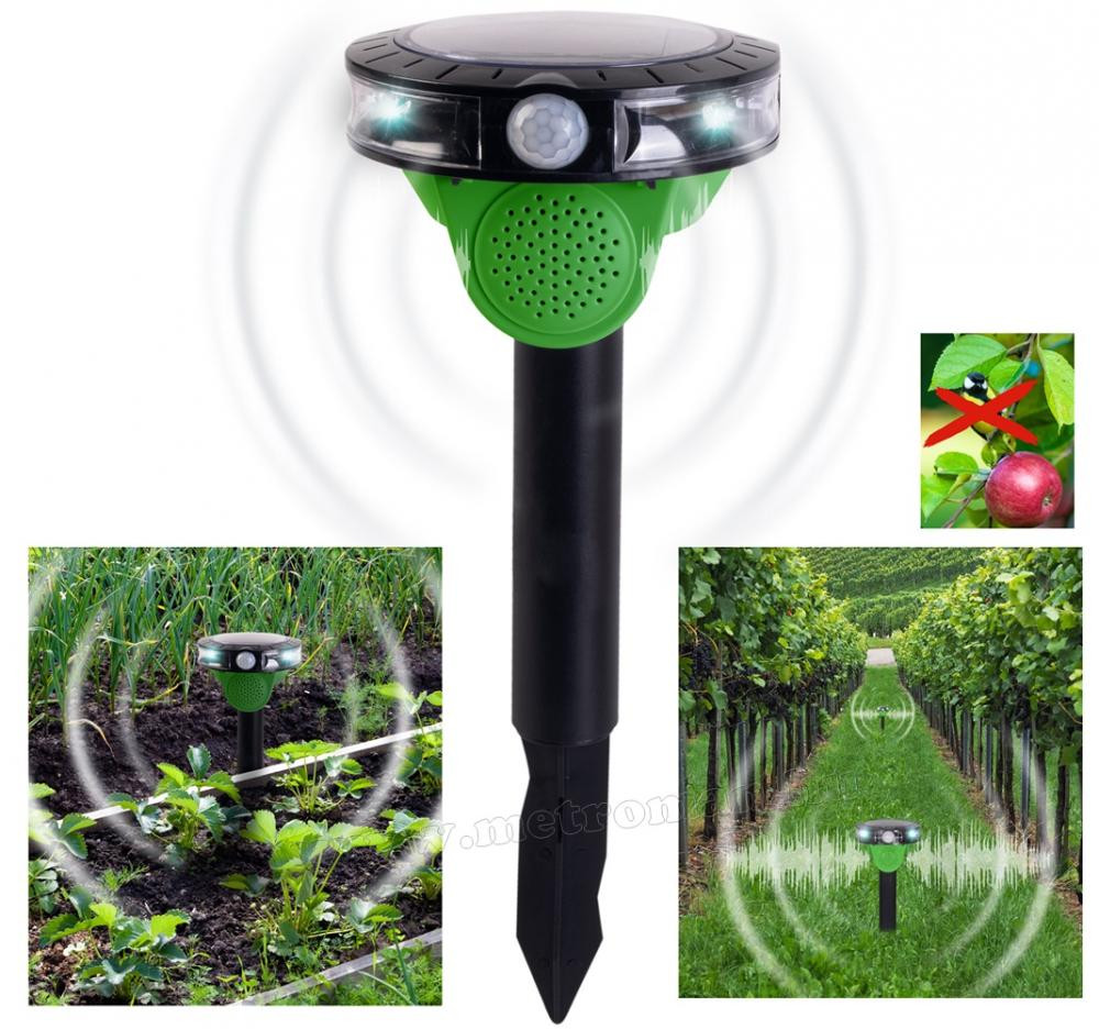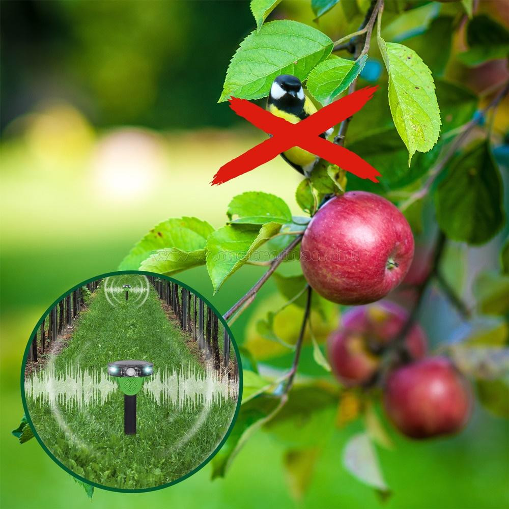 A madarak kevésbé érzékenyek az ultrahangra, ezért mindenképp jobb választás ez az erős hanghatást keltő napelemes madárriasztó. 3 különböző hangeffekt közül választhatunk és a riasztás hangereje is állítható. A riasztás csak mozgás érzékelésekor indul. A tartozék cövekkel egyszerűen a földbe szúrható.