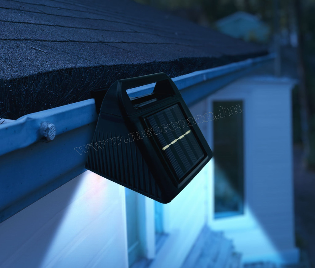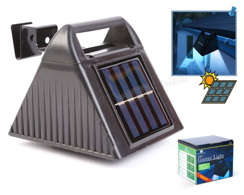 Különleges kialakítású és felfogatású, energiatakarékos szolárlámpa, Ereszcsatorna fény. Falra, ereszcsatornára, kerítésre, balkonra is rögzíthető. Nappal a napsütésnek köszönhetően a beépített akkumulátor feltöltődik, este pedig automatikusan bekapcsol a lámpa. Napelemes működésének köszönhetően nem szükséges kábeleznie, bárhová elhelyezheti, ahol nappal fel tud töltődni, ezáltal energiát takarít meg, miközben kellő fényerővel világítja meg a közlekedési útvonalakat, kerteket.