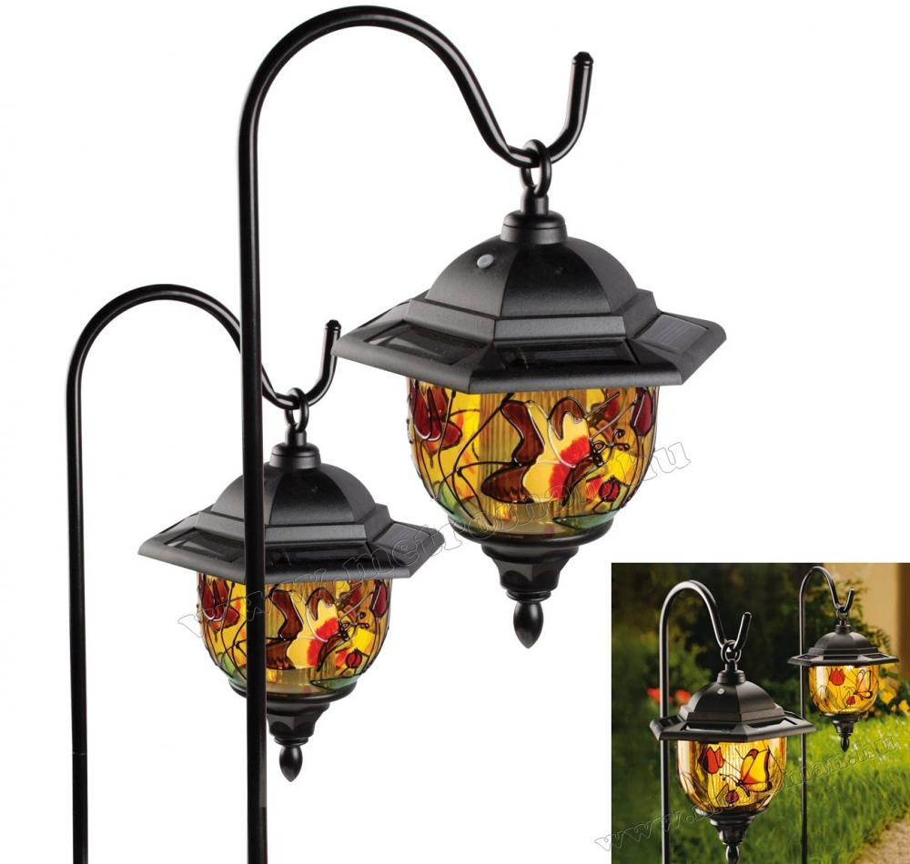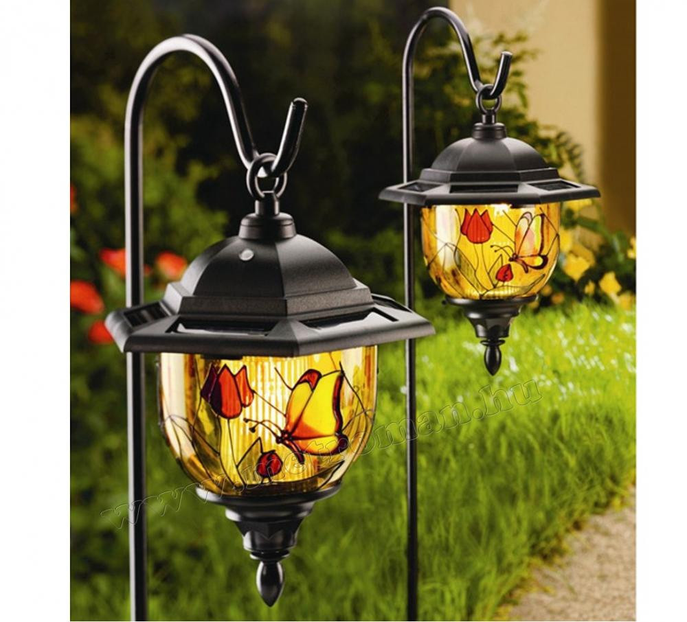 Dekoratív és hangulatos napelemes kerti Tiffany függő lámpa 2 db-os csomag.  A lámpában található akkumulátort a beépített napelem tölti, így nincs szükség külön áramforrásra.