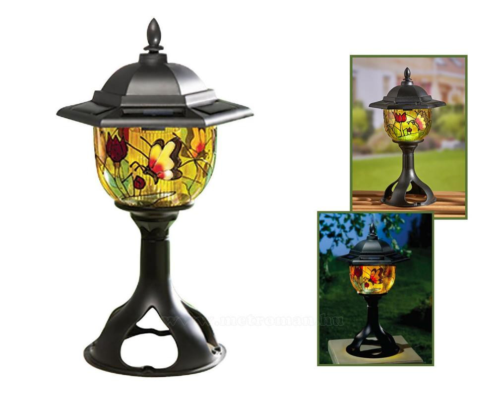 Dekoratív és hangulatos napelemes kerti asztali Tiffany álló lámpa.  A lámpában található akkumulátort a beépített 4 db napelem tölti, így nincs szükség külön áramforrásra.
