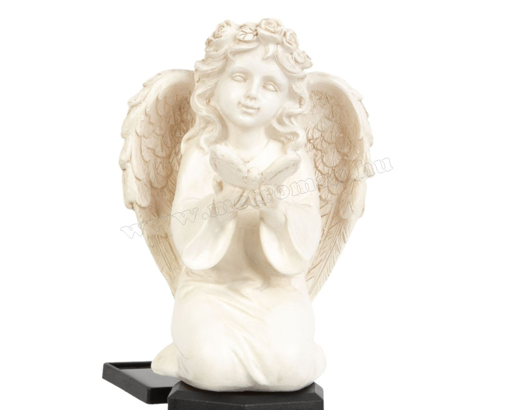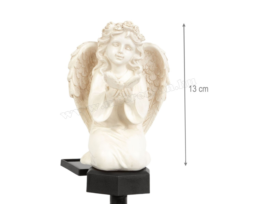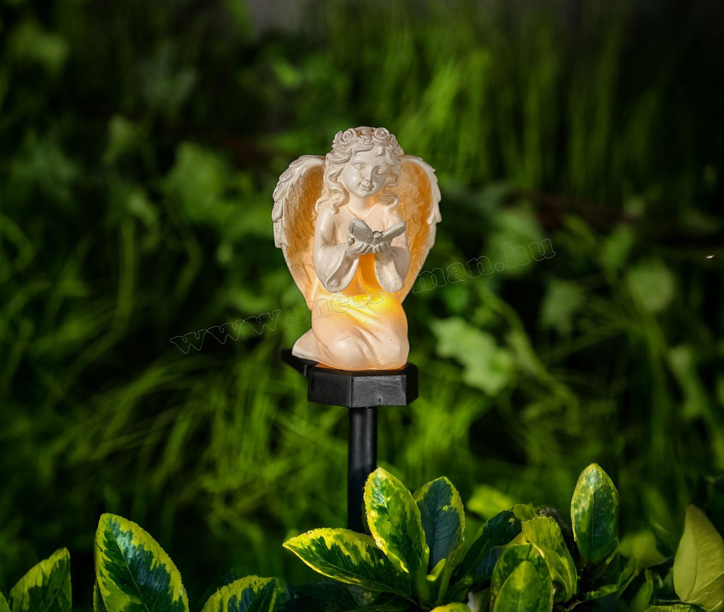 Varázslatos, szolár kerti dísz, napelemes hangulatfény, mely éjszaka életre kel. A békés angyal pillangóval a kezében kiváló dekoráció bármely napszakban, szürkület után lágy melegfehér fénnyel ragyogja be környezetét.