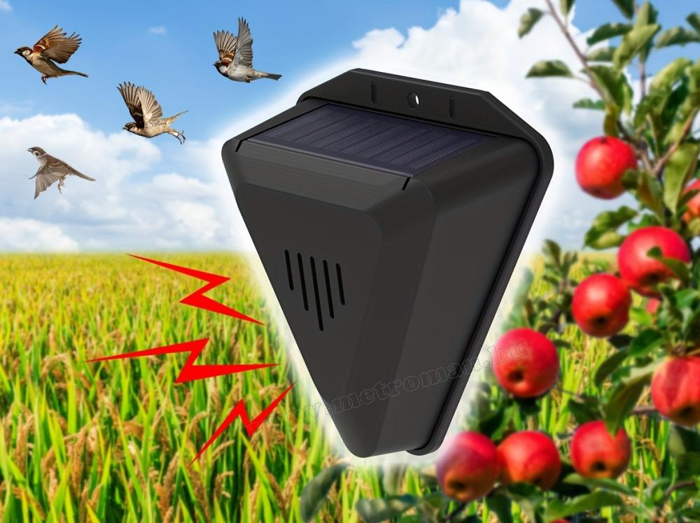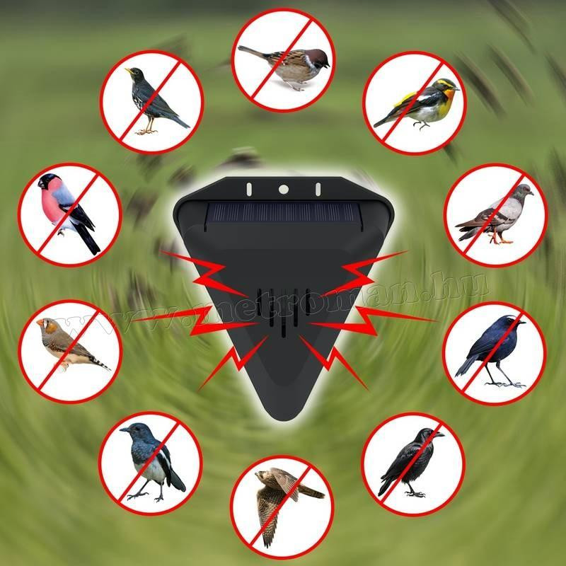 A madarak kevésbé érzékenyek az ultrahangra, ezért mindenképp jobb választás ez az erős hanghatást keltő napelemes madárriasztó. Ez a madár riasztó 3 percenként ad ki erős hallható hangokat, minden riasztáskor más és hangot. A váltakozó riasztási hang effektek jelentősen csökkentik a hozzászokás esélyét.  A 13 féle különböző hangeffekt elsősorban seregély, galamb és egyéb madarak elriasztására alkalmas, de sikeresen alkalmazható egyes vádállatok távoltartására is. A riasztó nappal működik, éjszakára pedig automatikusan lekapcsolódik.