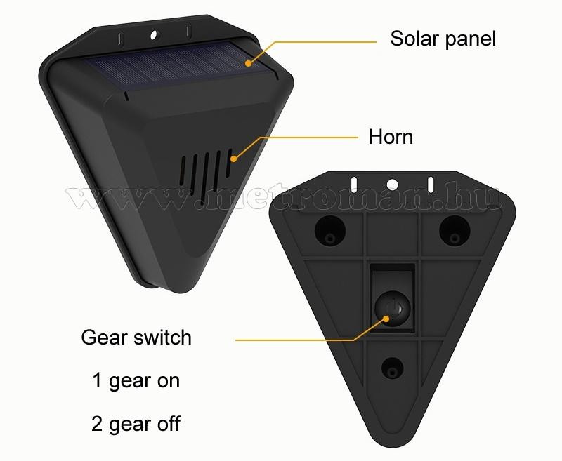 Elektromos, erős hallható hangot kibocsátó napelemes madárriasztó. Nem igényel külső tápellátást, a beépített akkumulátorát a riasztó tetején található napelem tölti.