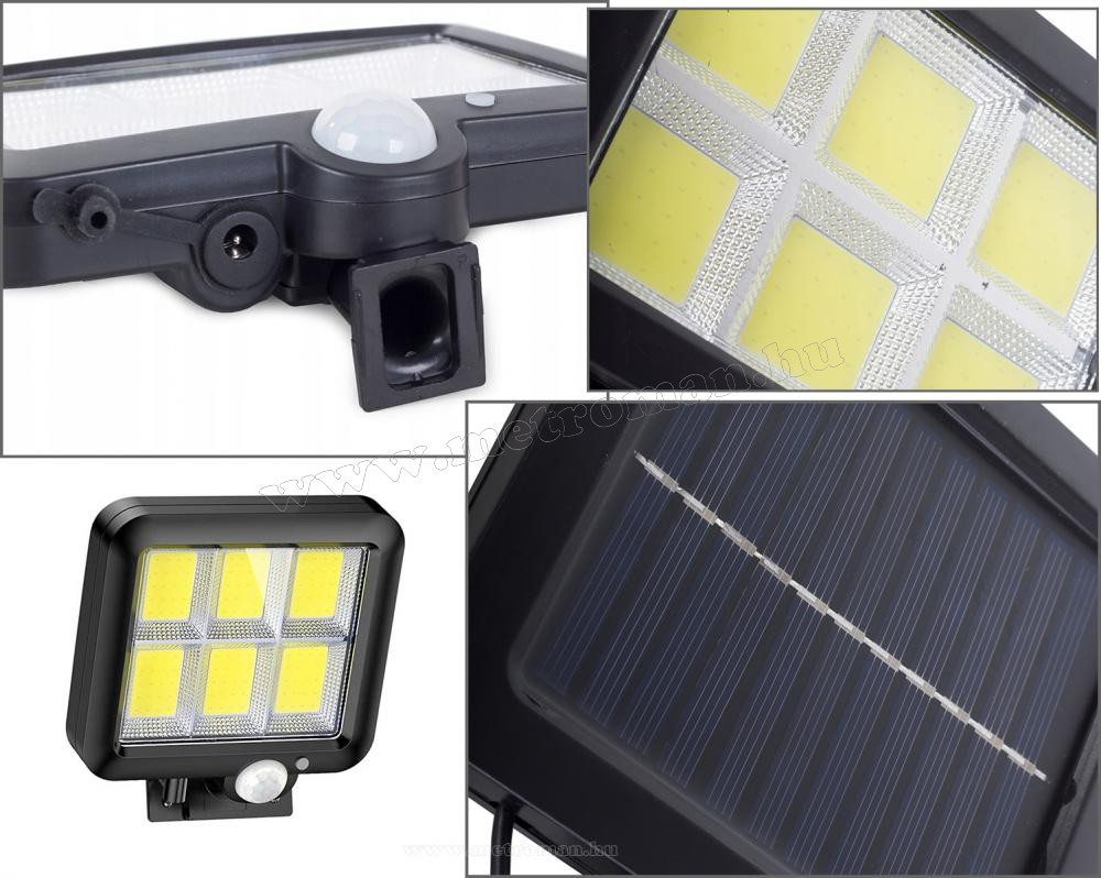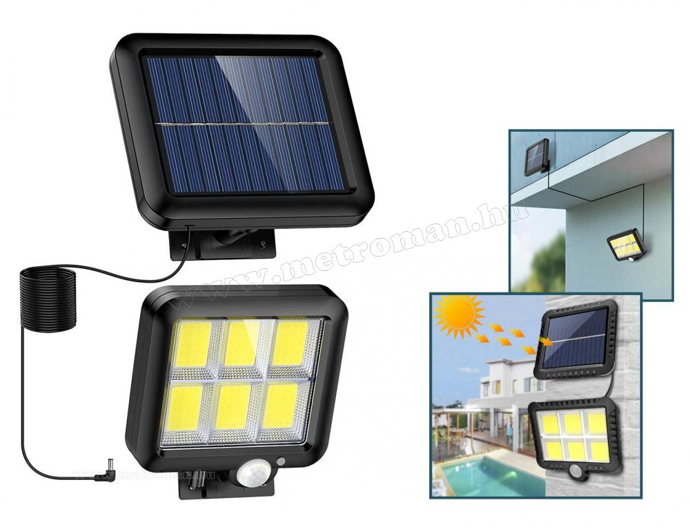 Napelemes kültéri lámpa COB LED-el, különálló napelemmel és 4,6 méteres kábellel, mely lehetővé teszi a minél optimálisabb helyre telepítést.