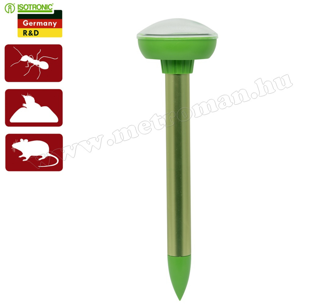 Az innovatív Napelemes hangya-, vakond-, egérriasztó az Isotronic kiváló terméke. Napelemmel működő, hordozható és rendkívül hatékonyan alkalmazható, bármilyen kémiai anyag nélkül mely magas fokú környezetvédelmet biztosít. Ezzel a készülékkel egy modern állatriasztó birtokába jutott. A készülék kvarcrezgéseket állít elő kb. 40 mp-es időközökben a 400-800 Hz ± 50 Hz frekvenciatartományban. A speciális keltésű hangfrekvenciás jelek és rezgések szabadtéri vizsgálatokban kb. 700 m² optimális hatáskörzetet mutattak. A talaj milyenségétől függően ez a körzet változhat. Mivel a hangfrekvenciás jelek és rezgések a talajban élő sok állat számára elviselhetetlenek, már néhány nap múlva más tájra vándorolnak el. Más hasznos állatokat viszont ezek a frekvenciák nem zavarnak. Ennek a napelemes állatriasztónak az alkalmazási területei a kertek, szántóföldek és más területek a szabadban, ahol nem kívánatos állatok élnek a talajban. A finom beállítású elektronika a nagyteljesítményű napelemtáblákkal még rossz fényviszonyok esetén is azonos szinten működik. Ez a készülék elűzi a pockokat, egereket, a vakondokat, hangyákat, kígyókat és más, a talajban élõ állatokat.