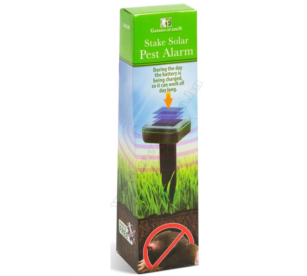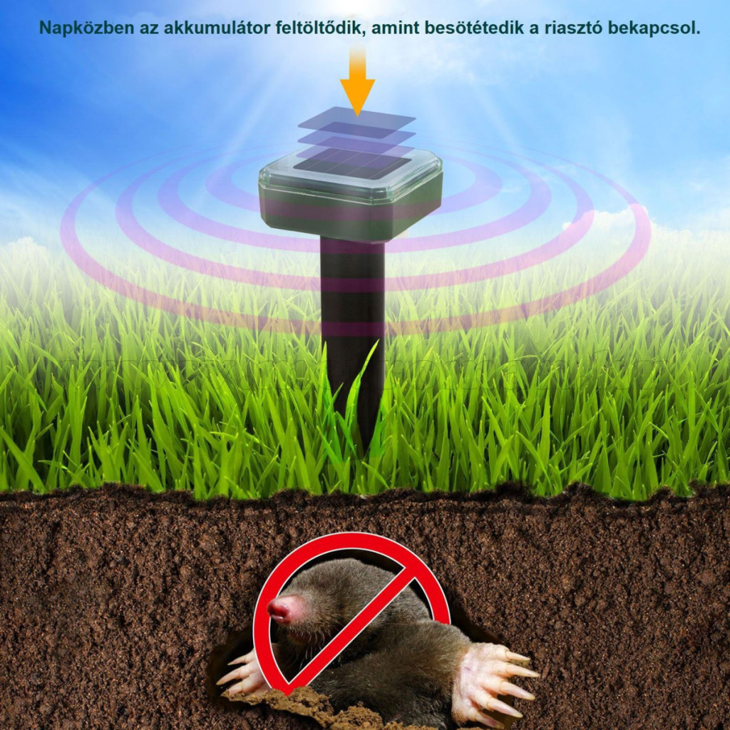 Ez a leszúrható szolár vakondriasztó ultrahangos jeleket bocsát ki a föld felszíne alatt is, amely a rágcsálók kifinomult hallását kihasználva elriasztja őket. Használatával nincsen szükség a környezetre káros vegyszerekre. Kiválóan alkalmas vakondok, pockok, egérfélék távoltartására.