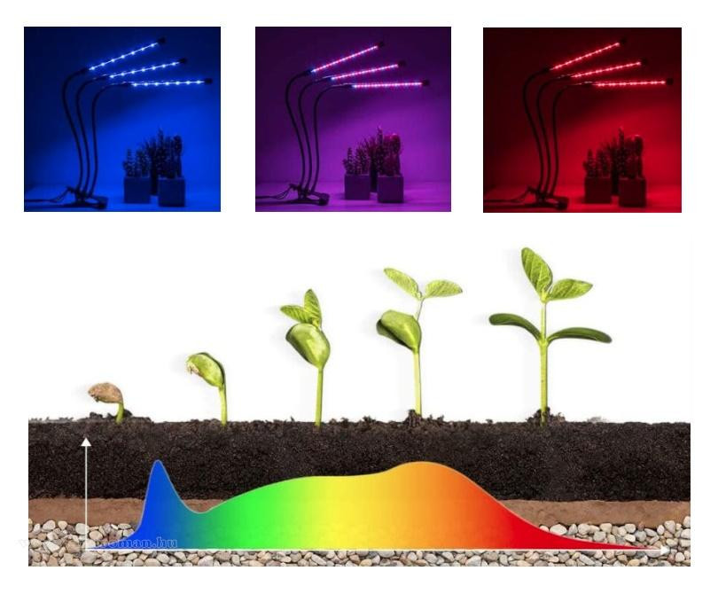 Növénynevelő lámpa piros és kék LED fénnyel. Ősszel és télen a rövidebb nappalok miatt a növények kevés fényt kapnak, így növekedésük és fejlődésük lelassul. A LED fények elősegítik a növények, fűszernövények, virágok fotoszintetizálását, így gyorsabban tudnak növekedni egész évben. Fóliáházakban, télikertekben, szobában, vagy a helyiségek sötétebb részeiben is egyaránt alkalmazható, és látványelemként is funkcionálhat.
