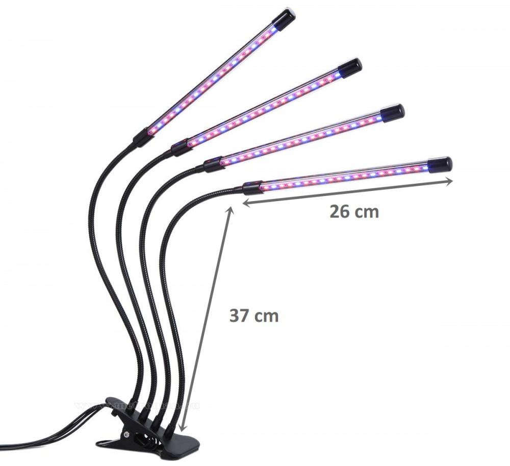 A lámpa hosszú, rugalmas karjain 4 LED csík található, amelyek gyakorlatilag bármilyen irányba hajlíthatók. A lámpa alján található csíptető lehetővé teszi, hogy könnyen felszerelje egy polcra vagy ablakpárkányra, ahol a növényei találhatók, ezenkívül megkönnyíti a készülék szállítását egyik helyiségből a másikba. A tápellátás hosszú USB kábelen keresztül történik, amely csatlakoztatható hálózati adapterhez (tartozék), powerbankhoz vagy bármilyen USB porthoz.