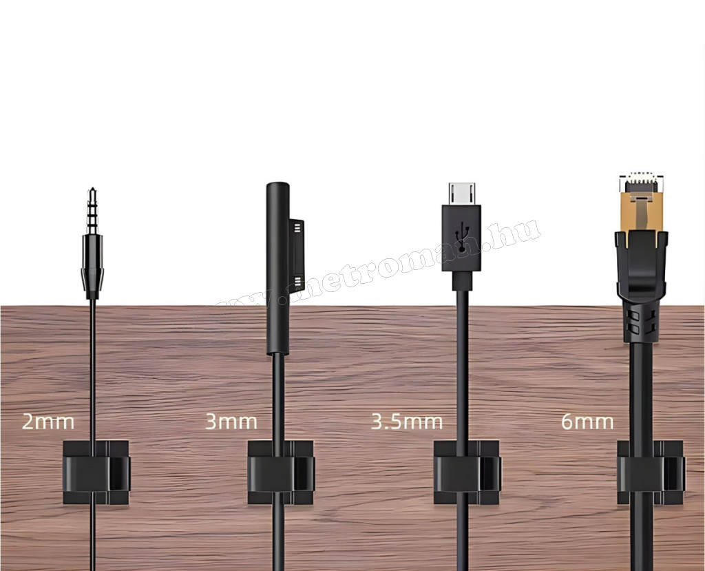 A patent a legtöbb szabványos kábelhez illeszkednek – pl. táp-, USB-, audio-, HDMI- és hálózati kábelekhez. Asztalra, falra, bútorra, autóba vagy elosztóra is helyezhető – bárhová, ahol a kábelrengeteg problémát okoz. A speciális kialakítás lehetővé teszi a kábel egyszerű behelyezését és kivételét a kábeltartó eltávolítása nélkül.