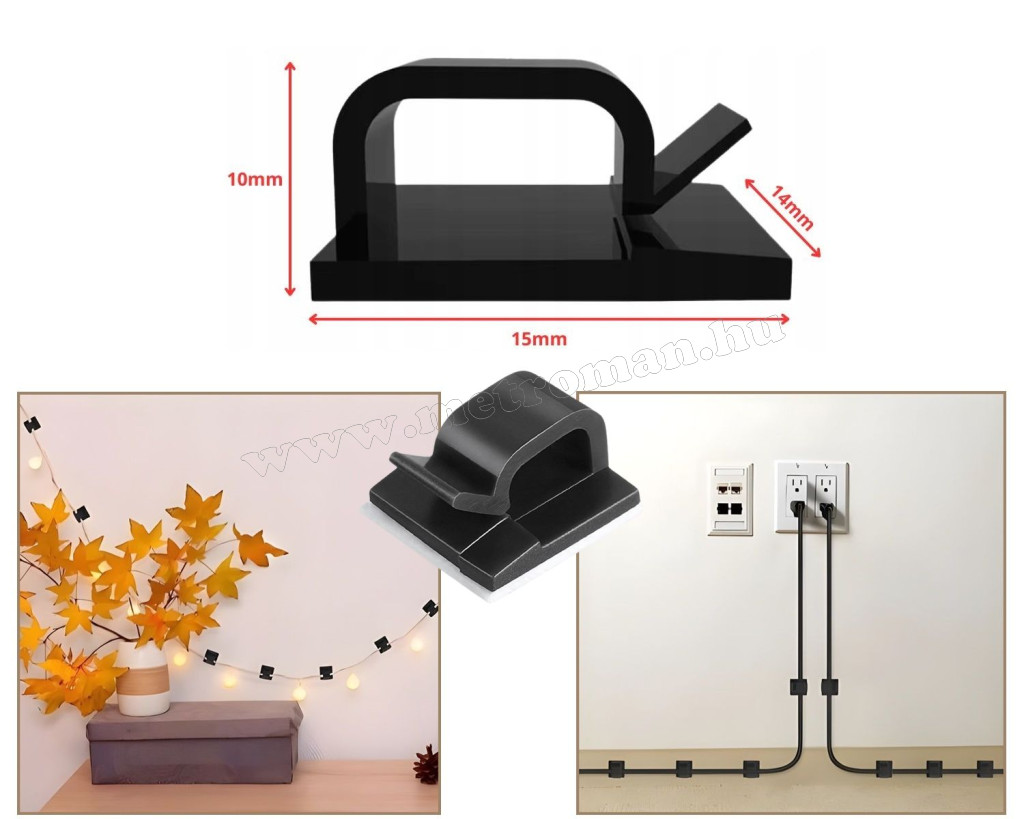 Ez az öntapadós kábeltartó szett tökéletes megoldást kínál a kábelek rendszerezésére otthonodban, az irodában vagy autóban is. Kompakt méretének és masszív ABS konstrukciójuknak köszönhetően gyorsan, fúrás nélküli felszerelhető. Egyszerűen húzd le a védőfóliát, és ragaszd a kívánt helyre – kész is!