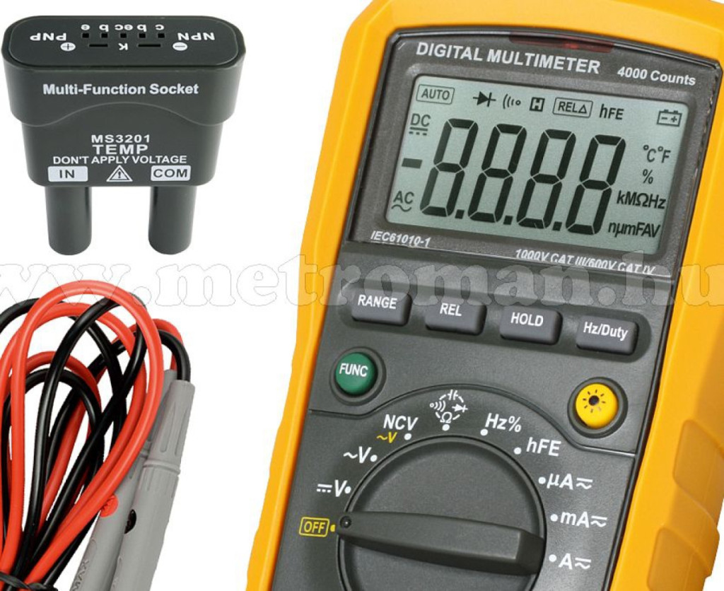 - Tartozékok: mérőzsinór és tranzisztor vizsgáló aljzat