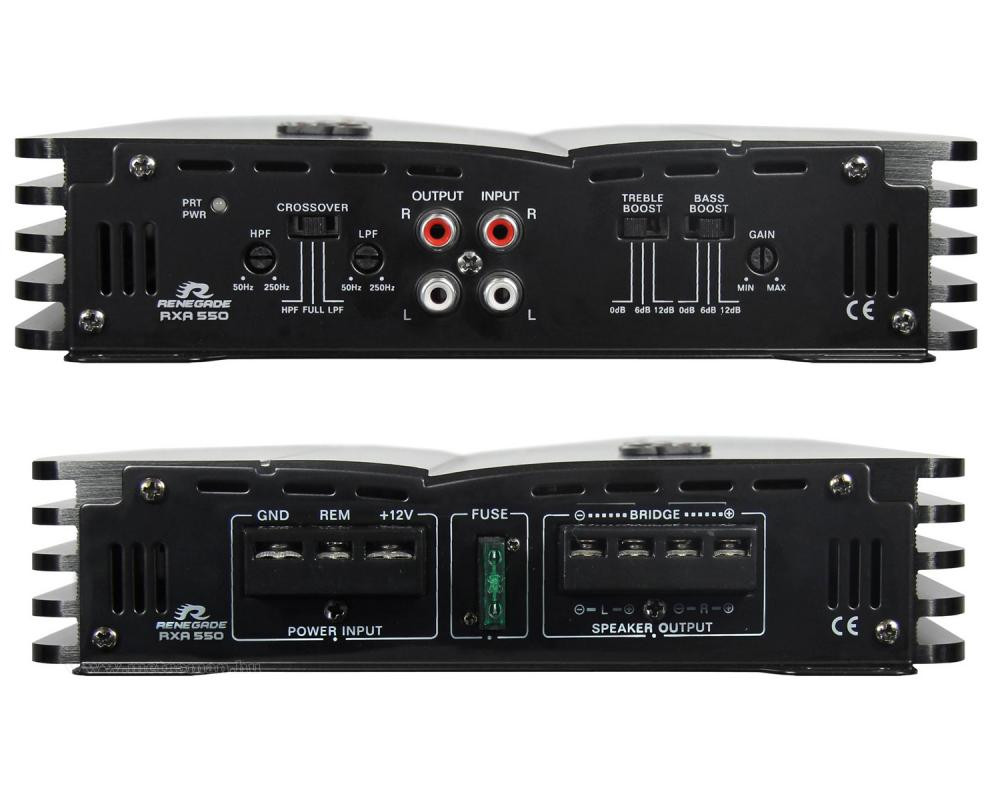 A RENEGADE RXA550 2 csatornás autós erősítő, felül áteresztő és alul áteresztő szűrőkkel, kompakt mérettel rendelkezik.