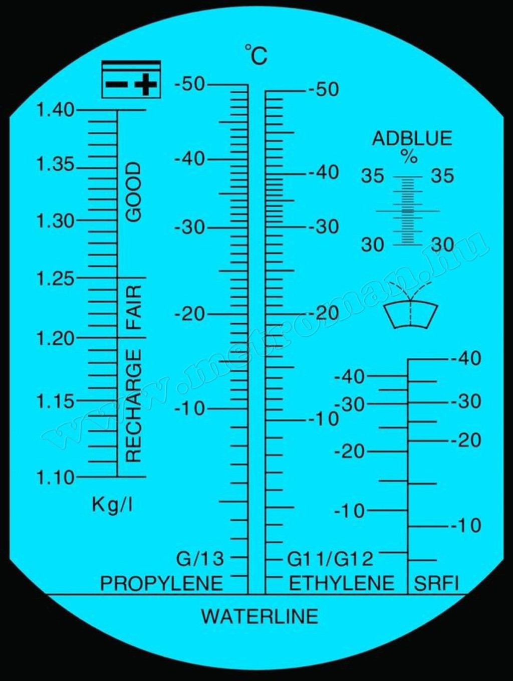 Hordozható, négyskálás optikai műszer, fagyálló és szélvédő mosó dermedési pont, akkusav és AdBlue mérésére is .