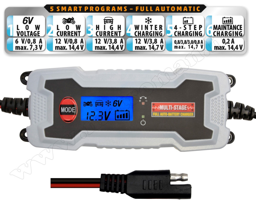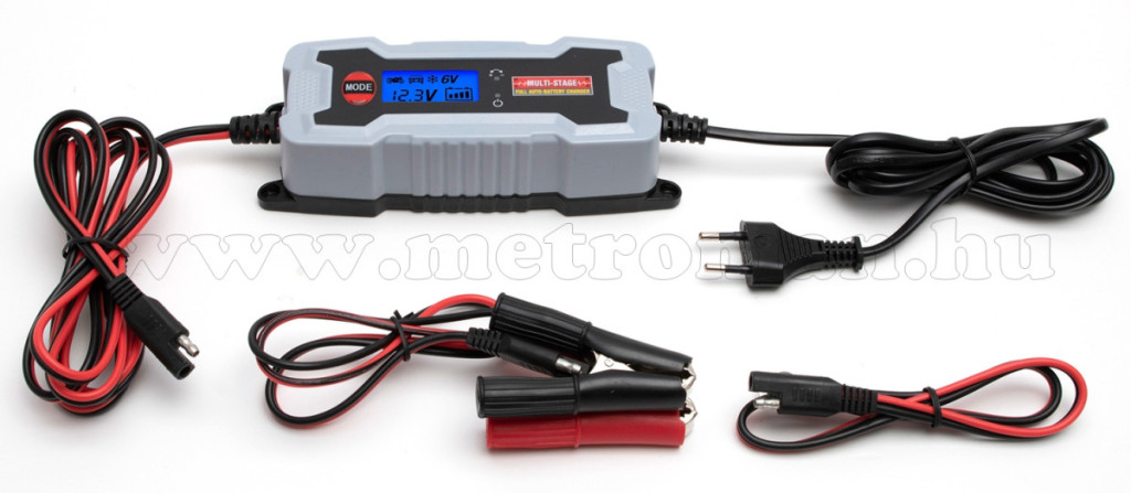 - Széles körben alkalmazható automata töltő 6 – 12 Volt / 1,2 – 120 Ah / 0,8 – 3,8 A