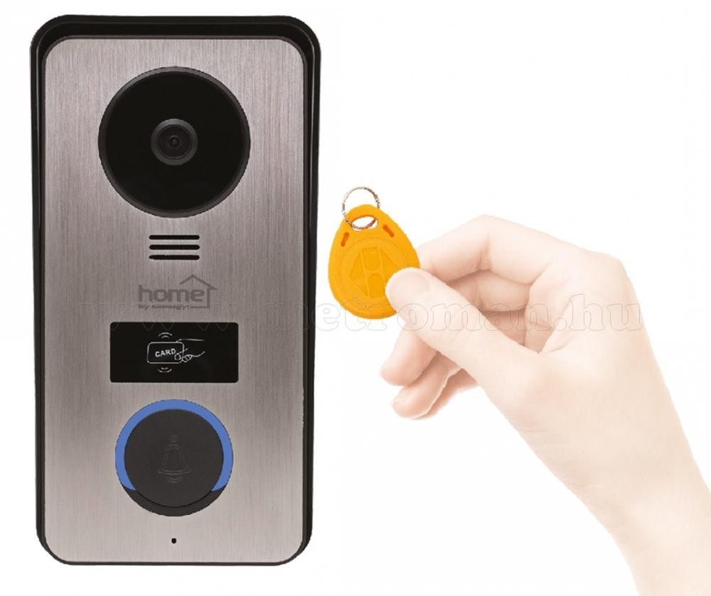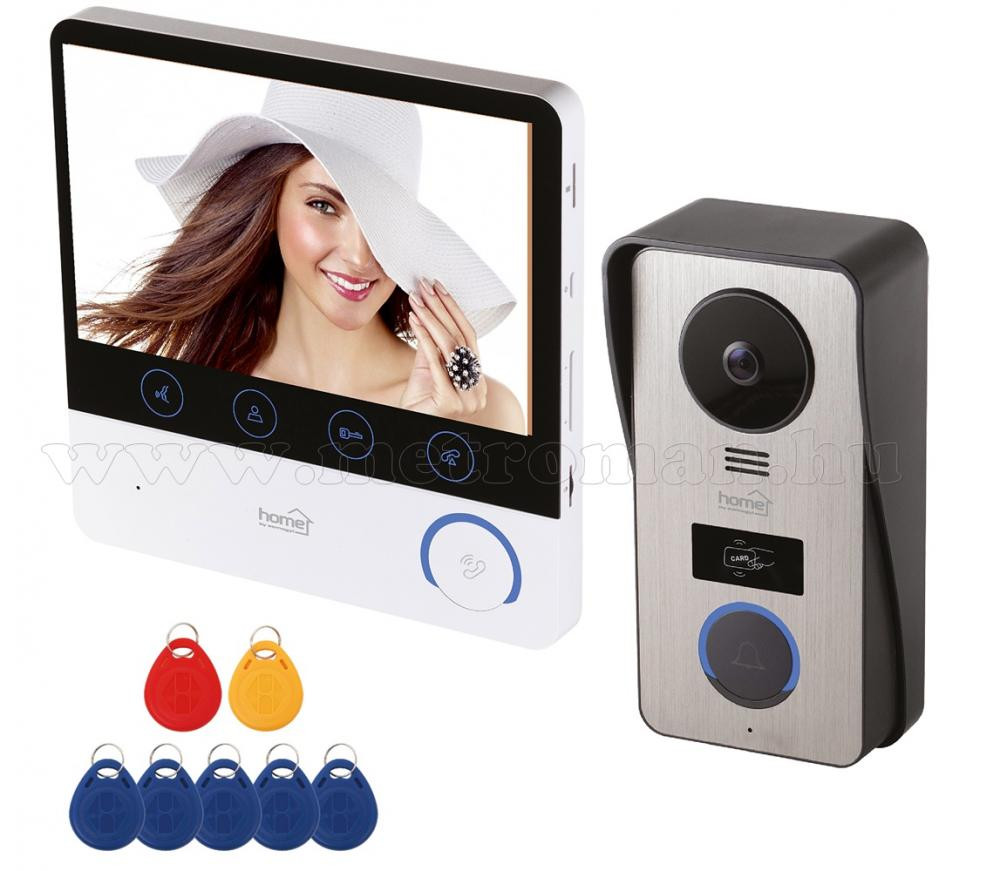 Komplett videó kaputelefon szett 7"-os LCD monitorral és kártyás beléptető elektronikával szerelt kültéri egységgel. A csomag tartalmazza az 5 db kulcstartó formájú beléptető kártyát is, melyet a kapu nyitásához egyszerűen csak a kültéri egységhez kell érintenie.