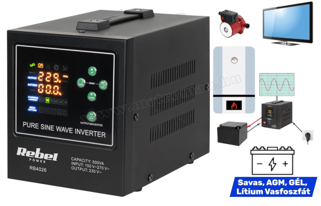 Ha megbízható, központi fűtéshez és keringető szivattyúhoz tervezett szinusz inverterre van szüksége, a Rebel Power 500 a legjobb választás. Ne hagyja, hogy a váratlan áramkimaradások megzavarják az otthoni kényelmét!