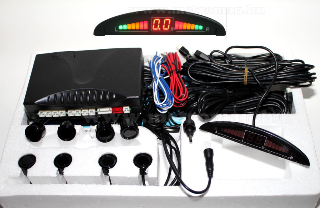 - a csomag tartalmaz 1 db központi egységet, 8 db ultrahangos érzékelőt, LCD kijelzőt, kábelköteget és a beszereléshez szükséges fúrót.