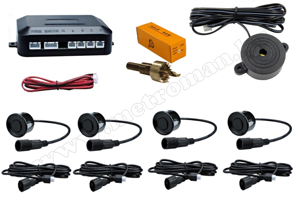 4 szenzoros autós tolatóradar, csak hangjelzéssel, fekete színű Érzékelő fejekkel.