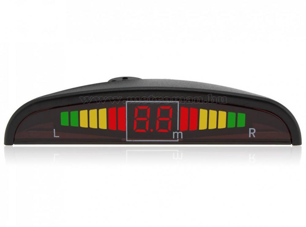 4 szenzoros autós tolatóradar hangjelzéssel és LED távolság kijelzővel. A távolság csökkenésével kijelzi az autó mögötti tárgy távolságát és egyre sűrűbb hang jelzéssel figyelmeztet az akadály közeledtére, ezáltal biztonságosabbá teszi a parkolást.