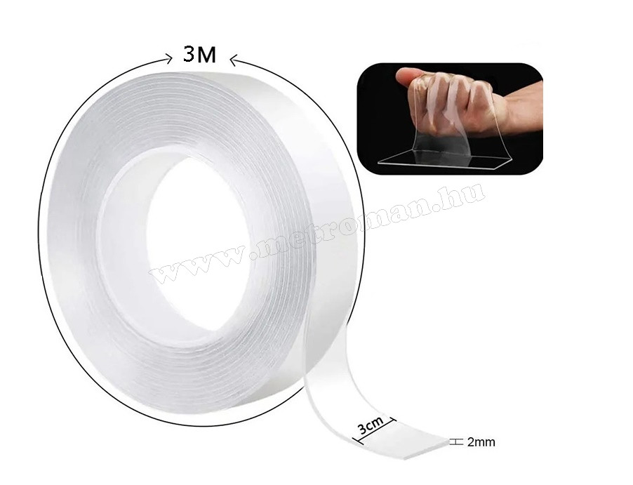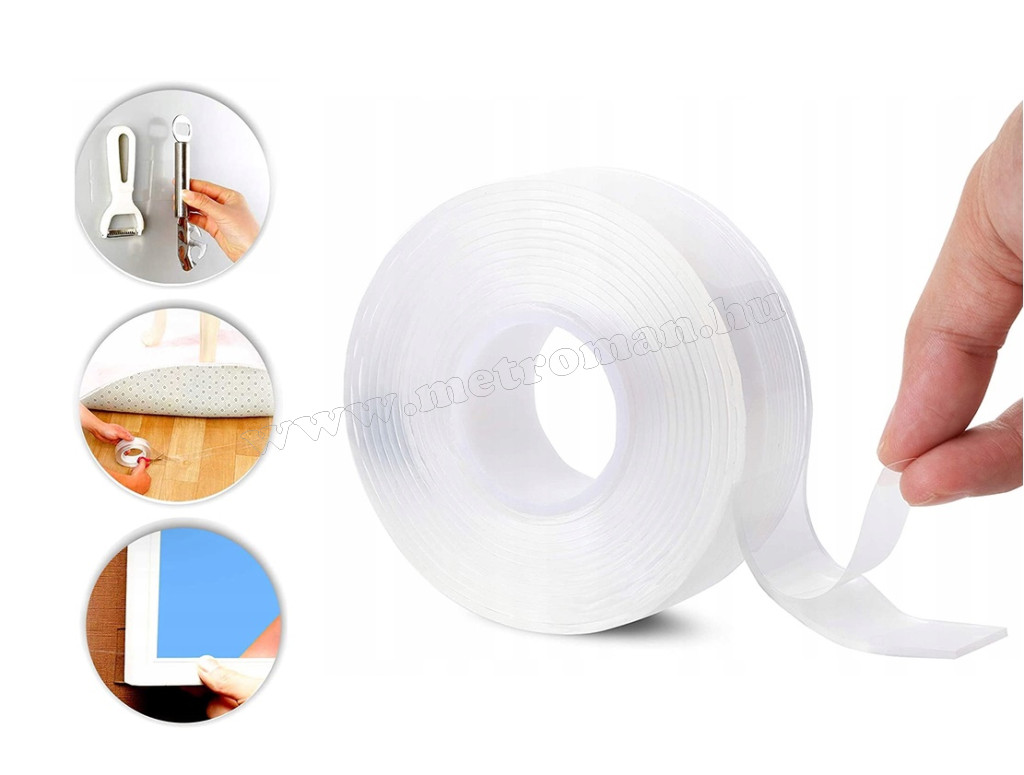 Átlátszó, újrafelhasználható, kétoldalas ragasztószalag, mellyel biztonságosan rögzíthetheti tárgyait.