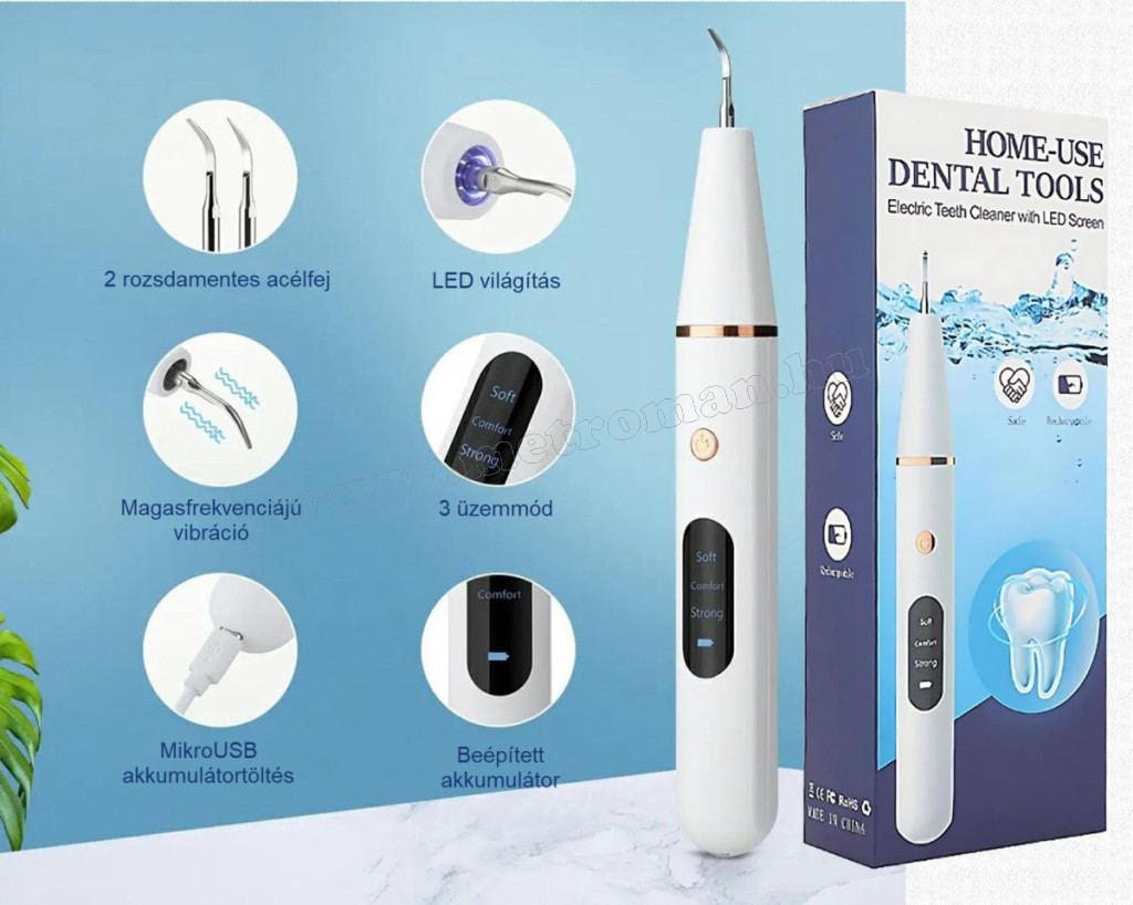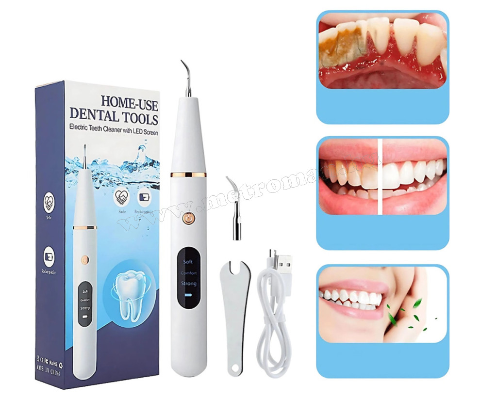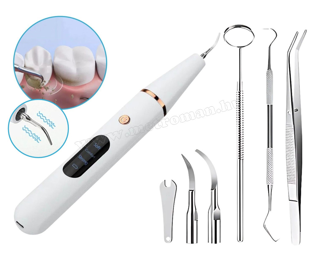 Ultrahangos fogkőeltávolító a fogak alapos tisztításához és a fogkő eltávolításához. A termék különösen ajánlott túlzott fogkővel, fogsorral vagy fogszabályozó készülékkel rendelkezők számára. Határozottan megkönnyíti a szájhigiénia gondozását, hatékonyan kiegészítve a hagyományos fogmosást. 3 működési móddal (puha, kényelmes, erős). A rezgések intenzitását a kényelemtől és a fogászati igényektől függően állíthatja be. A készlet tartalmaz 2 acélfejet a fogak különböző részeihez, lapos fej a felszíni, és éles fej a fogak közötti tisztításhoz. Használata közben a fogíny 100 %-os biztonságban van, a készülék csak kemény felülethez nyomva bocsátja ki a rezgéseket, puha felülethez érve leáll. A könnyű és kompakt kialakítás, valamint a beépített akkumulátor lehetővé teszi, hogy utazáskor is magával vihesse a készüléket. A készlet számos kiegészítőt tartalmaz (fogászati szonda, tükör és kaparó).