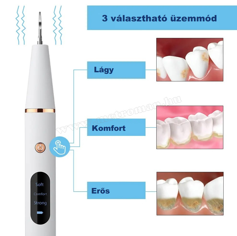 Mondjon búcsút a nehezen eltávolítható fogkőnek Ultrahangos fogkőeltávolító lepedékeltávolító segítségével. A fogkőeltávolító használata egyszerű, megkönnyíti a szájhigiénia megőrzését, hatékonyan kiegészíti a hagyományos fogmosást. A készülék puha felületekhez (pl. fogíny) érve leáll, csak kemény tárgyakhoz érve kezd működni.