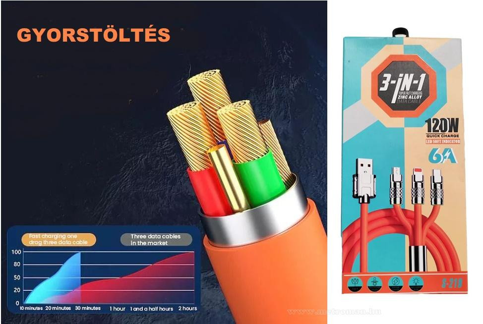 3 az 1-ben szilikon gyorstöltő adatkábel - 6A 12-24V