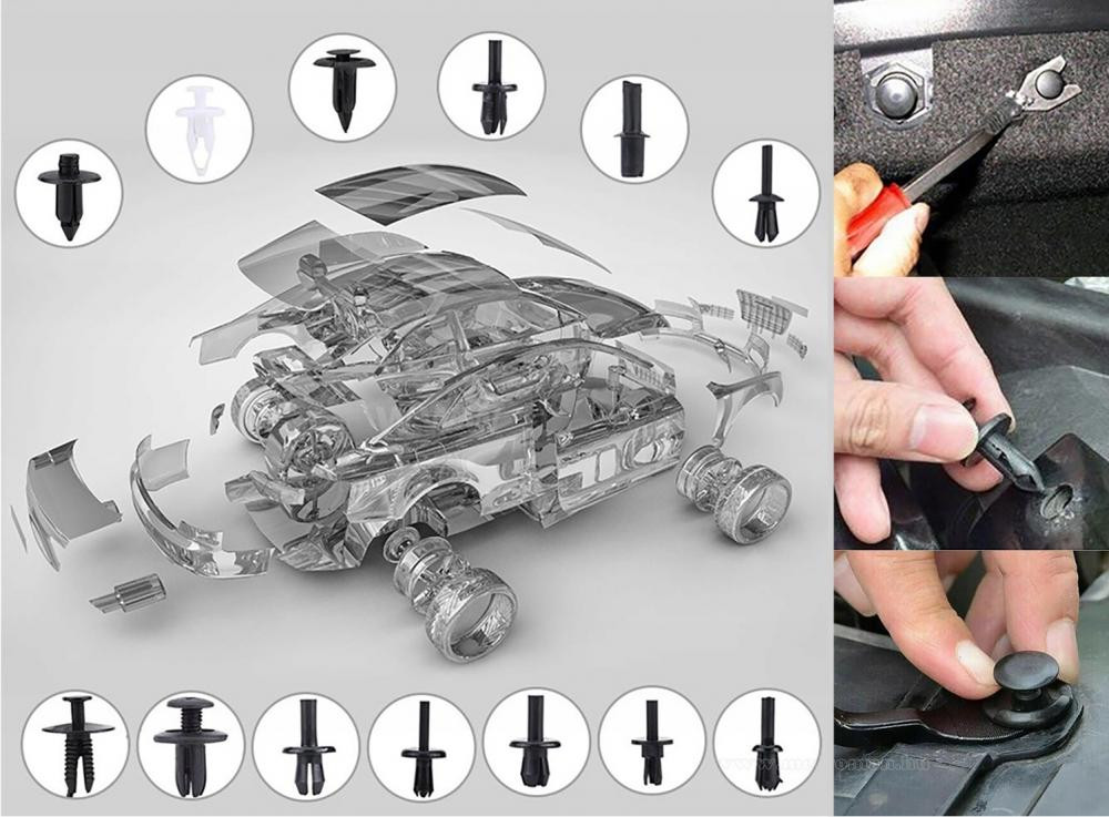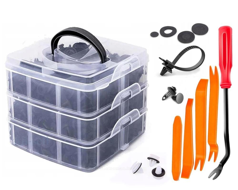663 darabos autós műanyag patent csomag, kárpit rögzítő készlet, mely tartalmazza a leggyakrabban használt patenteket és kiszedőket. Használhatató lökhárítókhoz, kerékívekhez, rátétekhez, kárpitokhoz, fotelekhez és ülésekhez, kárpitokhoz, huzatrögzítőkhöz, ajtólapokhoz, burkolatkapcsokhoz
