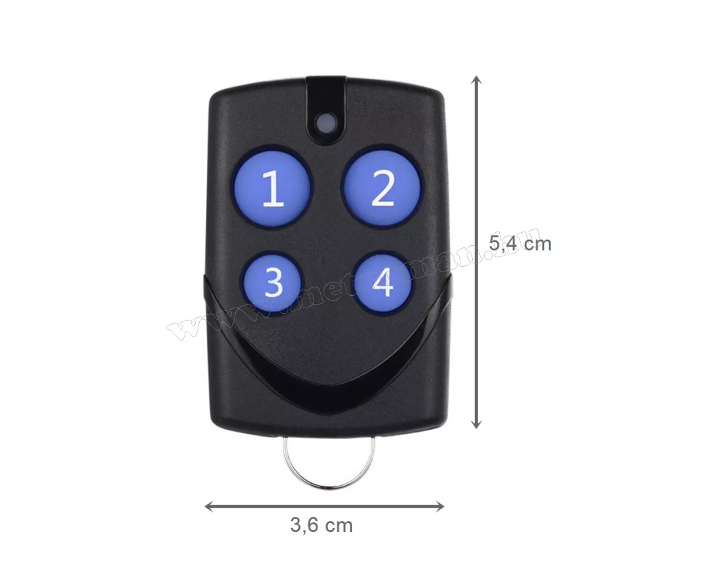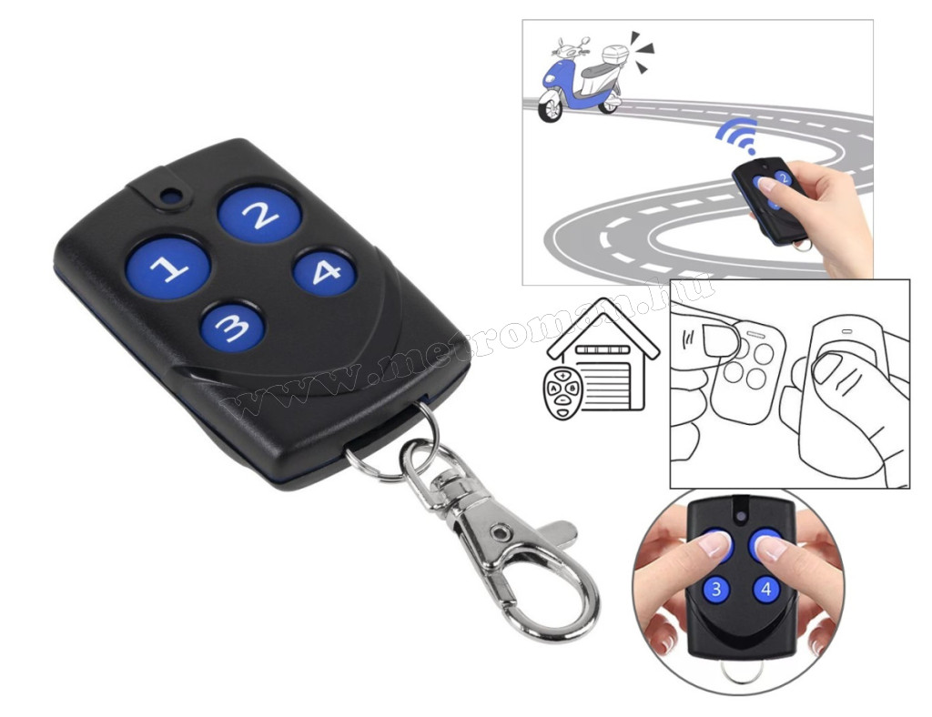 Fix. kódos univerzális tanítható távirányító, mely alkalmas riasztók, autóriasztók, kapunyitók, garázskapuk távirányítóinak bővítésére vagy elveszett távirányítóinak pótlására. Mindegyik gombja külön tanítható, így akár 4 távirányítót is képes megtanulni.