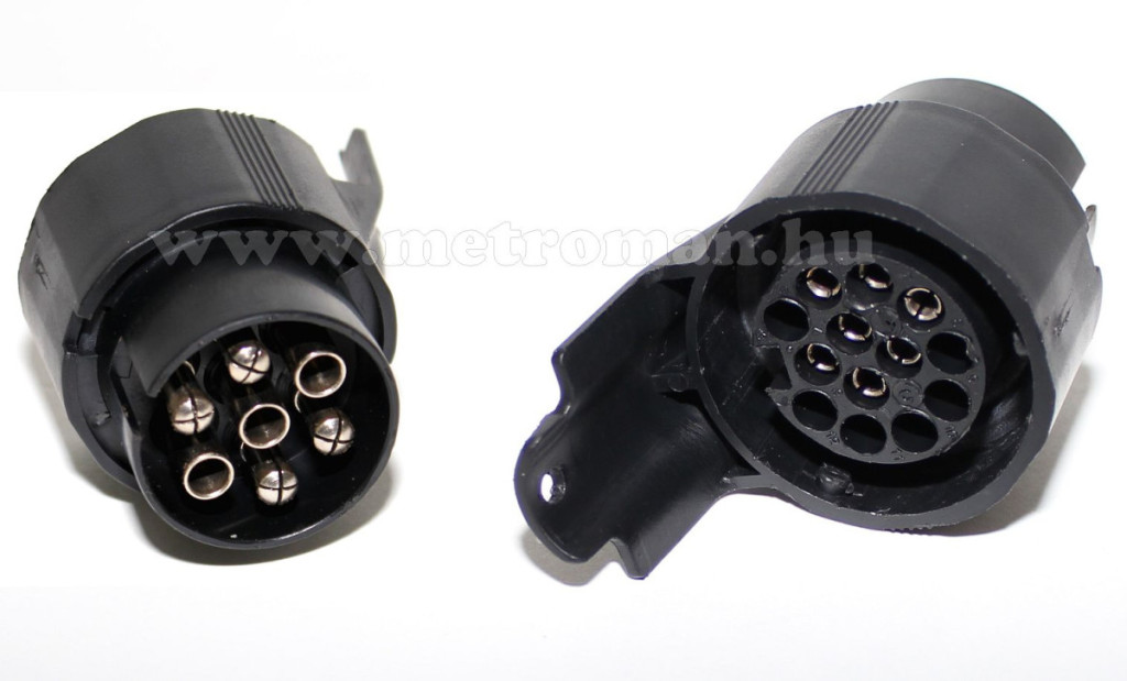 A 13 pólusú elektromos csatlakozóval ellátott ( német szabvány ) utánfutó, kerékpártartó csatlakozóját alakítja át a Magyarországon használt 7 pólusú csatlakozóra.