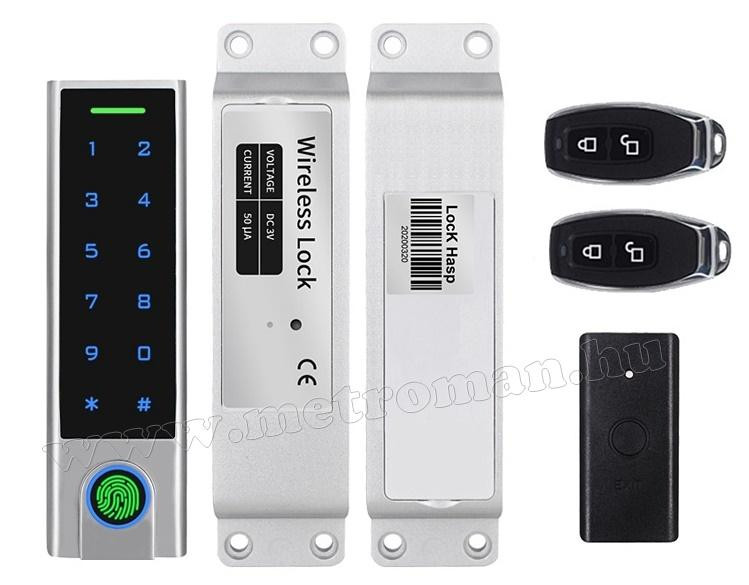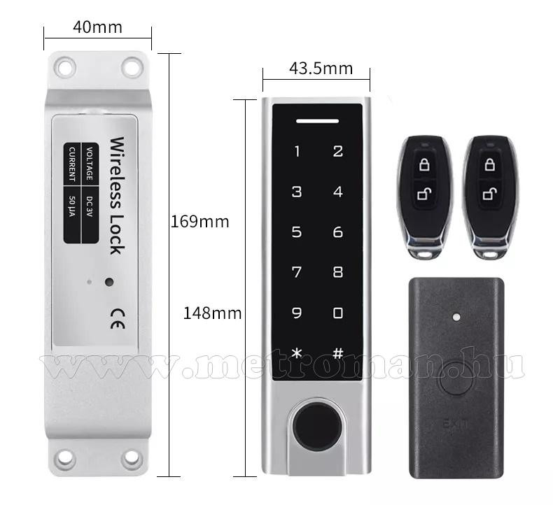 Vezeték nélküli Kódos Kártyás és Ujjlenyomat olvasós beléptető szett mágneszárral, távirányítóval MMA95W-RFID