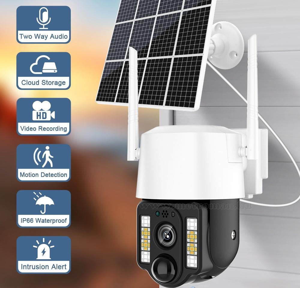 Kültéri Napelemes Wifi megfigyelőkamera, mely pár perc alatt egyszerűen, vezeték nélkül telepíthető. A V380PRO iPhone / Android APP letöltésével élőben nézheti a kamera képét vagy az SD kártyára rögzített felvételeket, bárhonnan okostelefonjáról vagy akár PC-ről is.