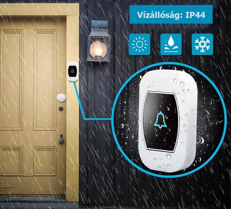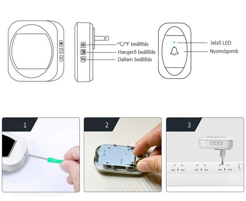 - Modern vezeték nélküli csengő fehér színben. A beltéri egység hőmérő funkcióval (°C/°F) van ellátva, melynek eredénye a digitális LCD kijelzőn olvasható.