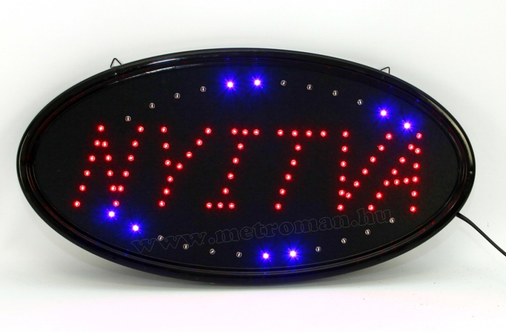Messziről is jól látható és feltűnő LED Nyitva tábla figyelemfelhívó kék futófénnyel.