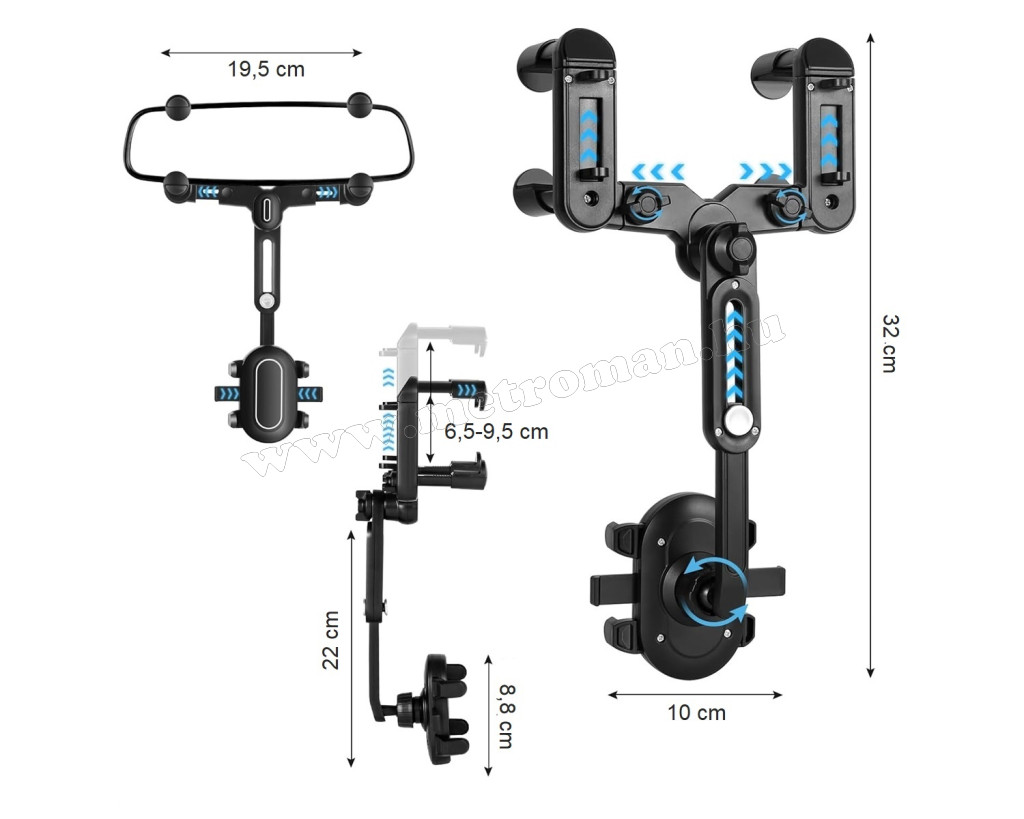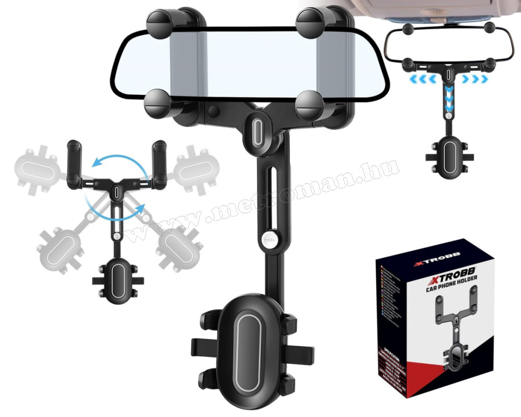 Ha szüksége van arra, hogy telefonja mindig szem előtt legyen, ezt a visszapillantó tükörre rögzíthető telefon tartót Önnek találták ki! Állítható dőlésszöggel rendelkezik, 360°-ban forgatható, ennek köszönhetően pontosan úgy állíthatja be a telefon pozícióját, ahogyan szükséges. Az univerzális, több ponton is állítható szorítókarok  segítségével a legtöbb visszapillantótükörre könnyen felszerelhető. A telefontaró szélessége állítható, max. 9,5 cm széles készülékekkel kompatibilis.